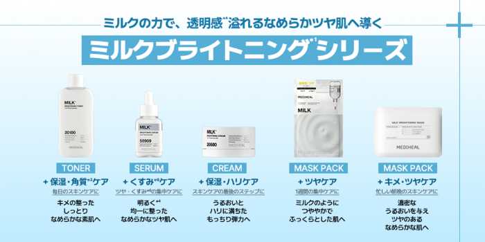 今回の新作は「ミルクブライトニング¹ ライン」から誕生。ミルク成分を配合し、肌にうるおいを与えながら不要な角質³をやさしくケアし、なめらかで透明感*⁴のある肌へ導きます。