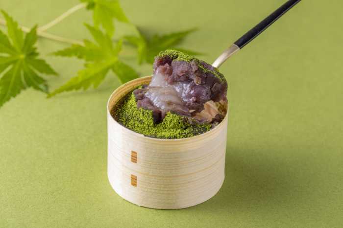 小ぶりなわっぱに美しく収められた餅スイーツ。やわらかく伸びのあるお餅に、こしあんとかのこ豆を重ね、抹茶の深みを何層にも感じられる上品な味わいです。