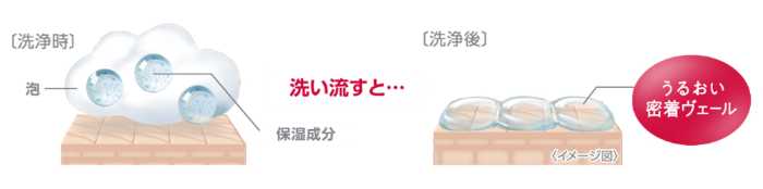 さらに、独自の「うるおい密着ヴェール」により、すすぎ時に保湿成分が肌に密着しやすい状態へ変化。洗うたびにしっとり感が続き、お風呂上がりの乾燥を防ぎます。