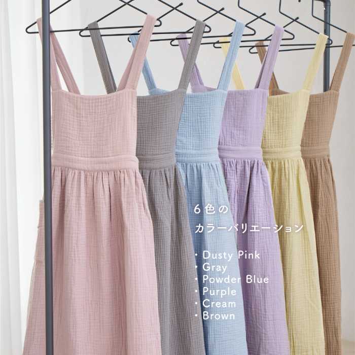 素材は綿100%で、やわらかな肌触りと軽やかな着心地が魅力です。カラーはダスティピンク、グレー、パウダーブルー、パープル、クリーム、ブラウンの全6色展開。