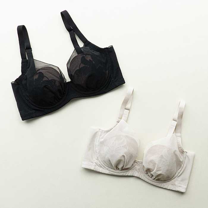 デザインは刺繍糸とシフォンチュールを組み合わせた上品な仕上がりで、凹凸が少なくアウターに響きにくいのも嬉しいポイント。