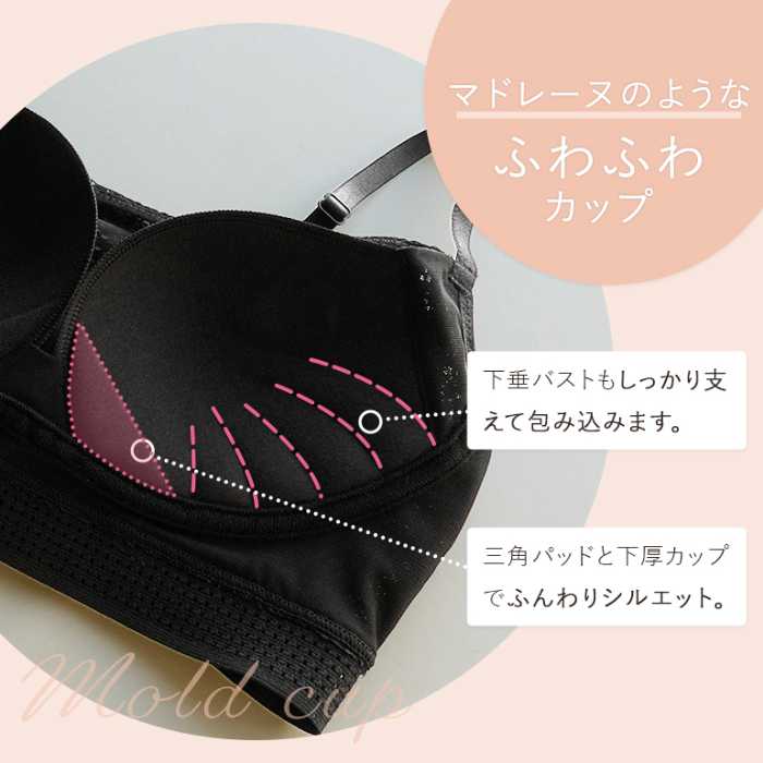 接触冷感機能付きで、汗ばむ季節もひんやり快適。さらにノンワイヤーながら、独自の「マドレーヌカップ」によって立体的なバストラインを実現します。