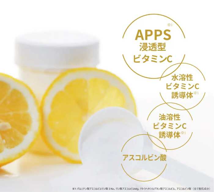 APPS¹⁰(浸透型ビタミンC誘導体)をはじめ、水溶性・油溶性ビタミンC誘導体¹¹¹²やアスコルビン酸¹³をバランスよく配合し、時間差で肌にアプローチします。