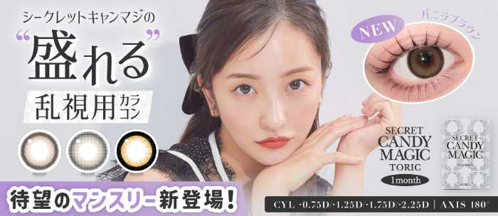 乱視だからといって、カラコンのおしゃれをあきらめる必要はありません。「secret candymagic TORIC 1month」は、見た目の可愛さと視界の快適さを両立した理想のアイテム。
