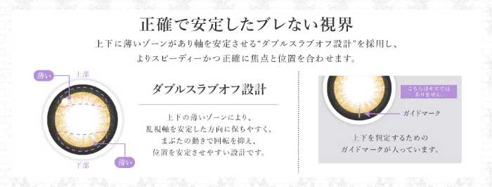 乱視用レンズとしての機能性にもこだわりが満載。採用されている“ダブルスラブオフ設計”は、上下の薄いゾーンによってレンズの回転を抑え、乱視軸を安定させる構造です。