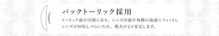 さらに、“バックトーリック”構造を採用することで、レンズ内面が角膜にフィットしやすくなり、より安定した見え方を実現。視界のブレを感じにくく、日常生活でもストレスフリーな装用感が期待できます。