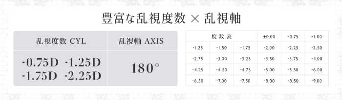 乱視度数や乱視軸のバリエーションも豊富で、自分に合ったレンズを選びやすいのも嬉しいポイントです。