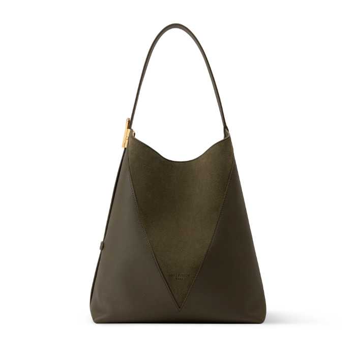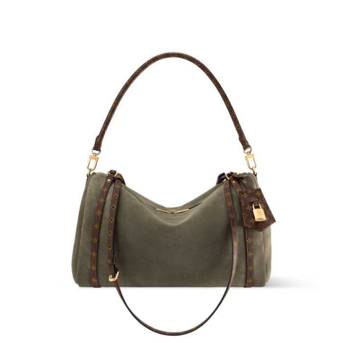「エクスプレスMM」はスエードカーフレザーを使用し、カーキカラーが洗練された印象。価格693,000円、サイズW36×H24×D18.5cm。調節可能ハンドルで実用性も◎。
