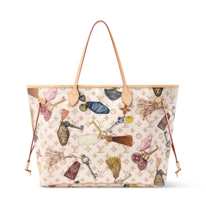 「ネヴァーフルGM」は価格346,500円、サイズW39×H32×D19cm。リネン×キャンバス素材で軽やかに持て、通勤から旅行まで幅広く活躍します。どちらも華やかなプリントがコーデの主役に♡