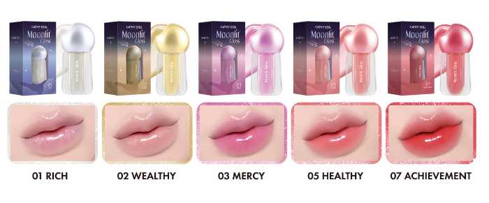 「Cathy Doll ムーンリットリップグロス」は、全5色展開(01 RICH:シルバー、02 WEALTHY:ゴールド、03 MERCY:ピンク、05 HEALTHY:ピーチ、07 ACHIEVEMENT:レッド)、価格は1,540円(税込)。
