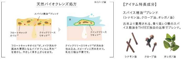 シリーズの中心となる「THREE バランシング クリア クレンジング オイル」は、バイオフィルムに着目した革新的な処方が魅力。