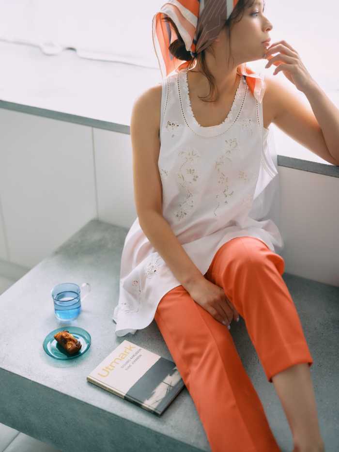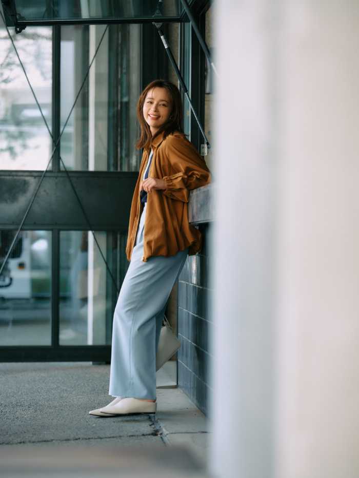 加藤ローサが着こなすスタイリングは、女性らしさと抜け感を両立。軽やかな素材感と美しいラインが、動くたびに自然な美しさを引き立てます。