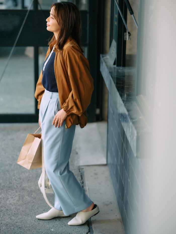 程よいワイド感で脚のラインを拾わず、上品な印象に。タック入りデザインで腰まわりもすっきり見え、スタイルアップ効果も期待できます。