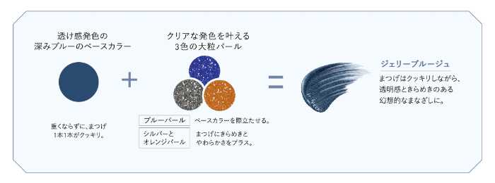 さらに、ブルー・シルバー・オレンジの3色の大粒パールを高配合。白くくすみやすいまつげにもクリアな輝きを与え、自然なツヤ感と立体感をプラスしてくれます。