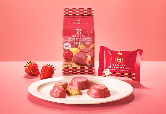 今回発売された『7カフェ濃苺フォンデュバターステイツクッキー』は、バター含有率34%のリッチなクッキーに、苺40%配合(※生換算)の濃苺ショコラをたっぷりとかけた春限定フレーバーです。