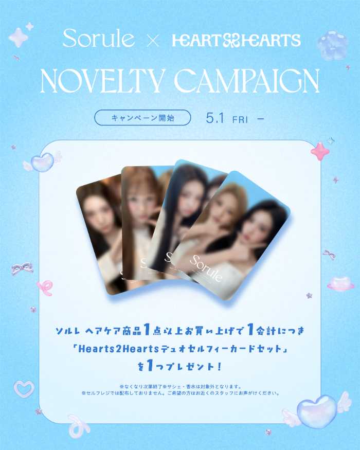 5月1日(金)より、対象店舗または公式オンラインストアBeautyFarmにて、「Sorule」ヘアケア商品を1点以上購入すると、「Hearts2Hearts」デュオセルフィーカードセットをプレゼント。