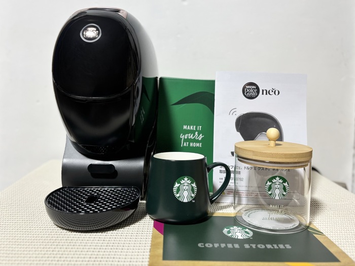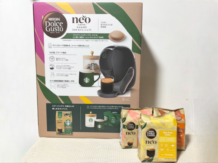 スタイリッシュな新色のコーヒーメーカー「ネスカフェ ドルチェ グスト ネオ カフェ シェア」、スターバックス® のロゴ入りアクセサリーが付属でついてきます。