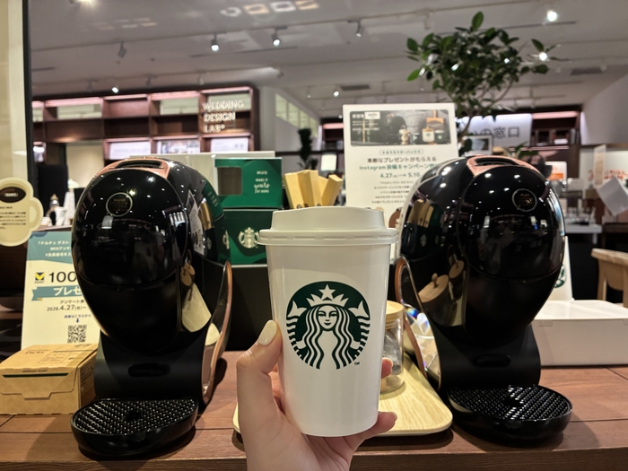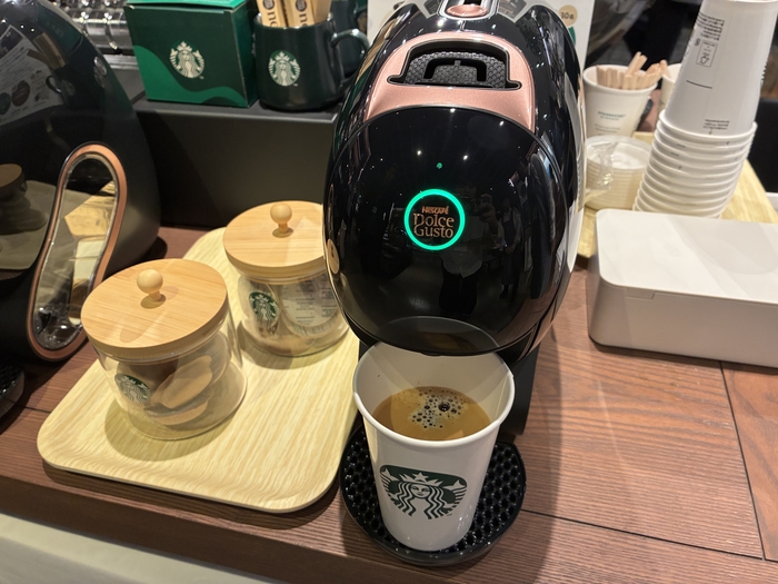 4月15日発売の新製品「ネオ カフェ シェアおうちでスターバックスセット」&「スターバックス® ハウス ブレンド」が展示されているので、実際の大きさや、機能性をご覧いただくことが可能です。
