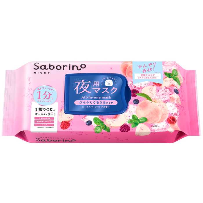 「サボリーノ お疲れさマスク N PS26<フェイスマスク>」は、30枚入り(287mL)1,540円。ピーチスパークリングの香りで、一日の終わりをやさしく包み込むような使用感です。